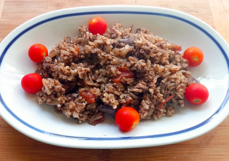 - A csirkemájat 2-3 részre vágtam, vöröshagymát, paradicsomot összevágtam, rizst, vizet kimértem