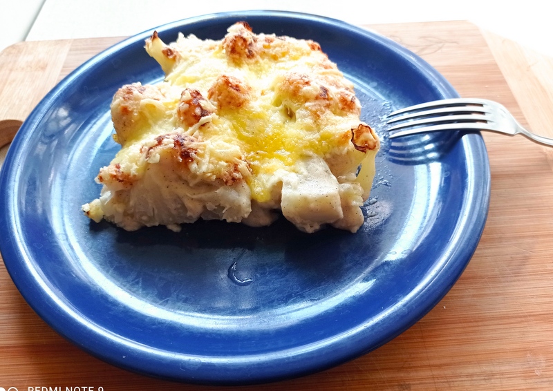 - A karfiolt a formába tettem, ráöntöttem a mártást.